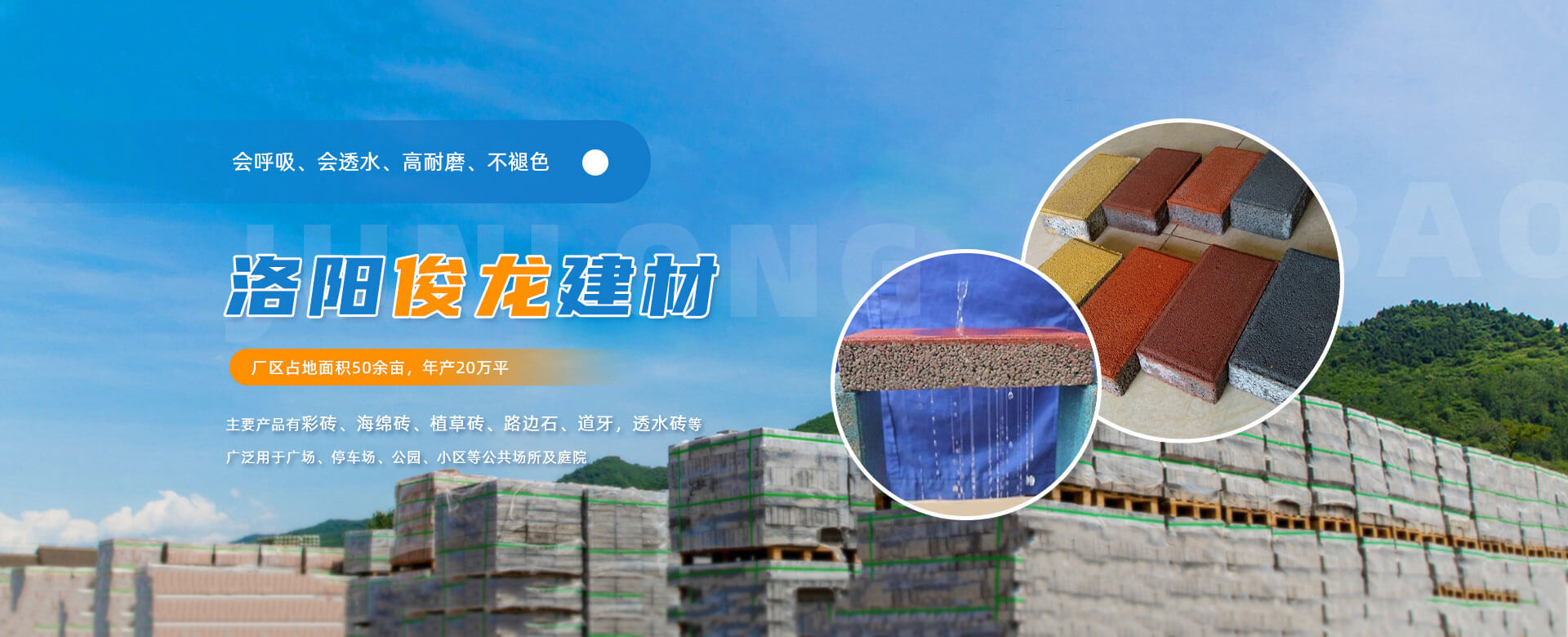 洛陽市洛龍區俊龍建材廠是一家致力于研發、生產、銷售、設計為主的企業。公司主要的建材產品有彩磚、海綿通體磚、植草磚、路邊石、透水磚等多樣化(成品)產品;公司堅持了“以市場為導向,以誠信為根本”的經營思想,所負責施工的工程,質量均為優良工程。  “質量優良,信譽為上”是公司一貫奉行的經營宗旨,為客戶提供更有品位的產品是我們的真誠心意,面對競爭日益激烈的市場,我公司將“強化集約管理,優化企業結構,打造具有核心競爭能力和優勢的建材企業”確立為公司的發展戰略,在今后的實際工作中,不斷加強自身建設,吸收融匯中外建材行業的新技術、新工藝,在持續改進的基礎上,為省內外客戶提供更好的服務。  洛陽市洛龍區俊龍建材廠您值得信賴的合作伙伴!  本公司長期供應:透水磚、彩磚、植草磚(井字磚 中空植草磚)、海綿通體磚、荷蘭磚、路側石 、道牙石、圍樹石等。